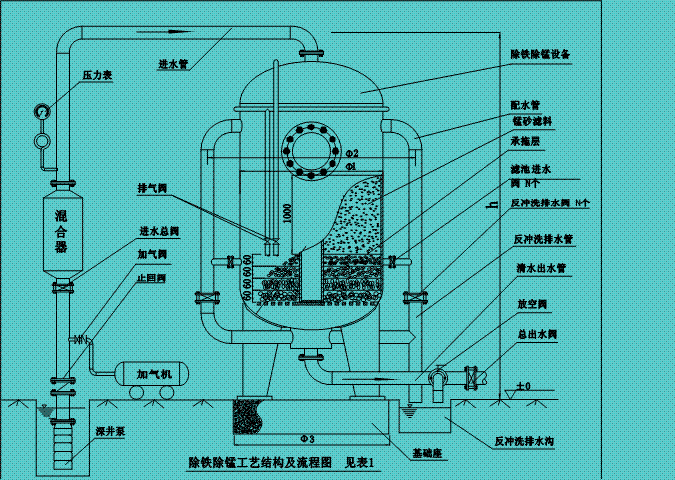 3.除鐵(錳)器的濾料應每年進行翻砂整理,并觀察濾料的層度,如發現濾層減薄,及時補充濾層。